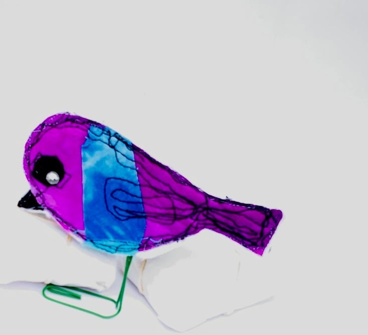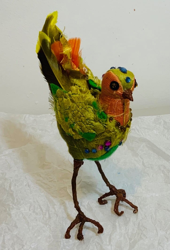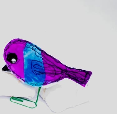 A small cloth birdie. Great for little gifty. These birds come in random colours, with crystal beads for eyes and wire legs and feet.