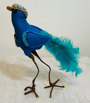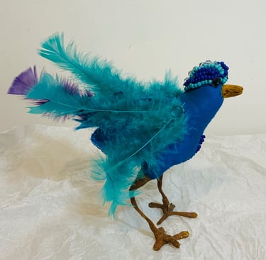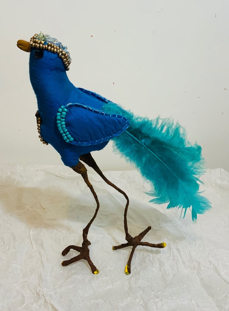 SOLD Tall Aqua bird. Silk, feathers and beading.