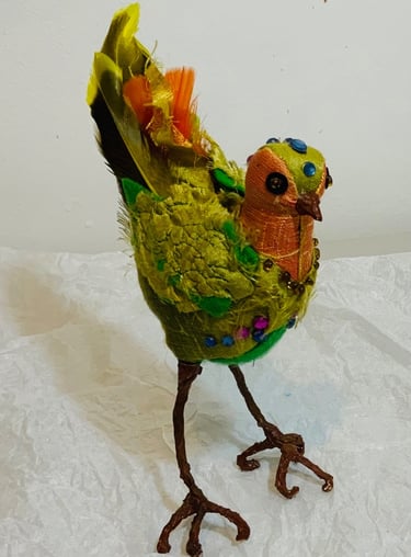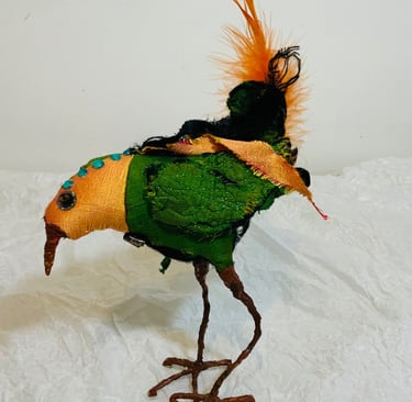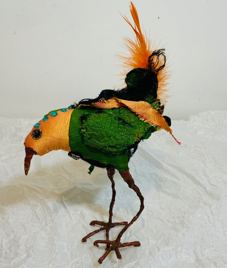 These fun birds are made in silk with bright feathers, beading and crystals. Each one is individually crafted with their own quirky personality.
