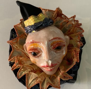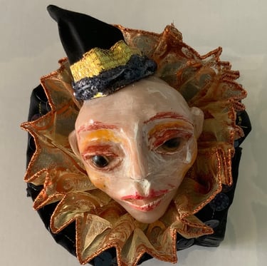 SOLD. This is Pierrot. Made of polymer with plastic eyes, cotton and net collar with sequins and a little hat. Sits on a wooden base covered in black paper and varnished.