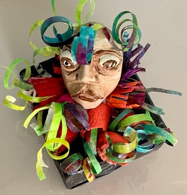 This is Acid head. Made of polymer with handmade paper detail. Sits on wooden base covered in black paper and varnished