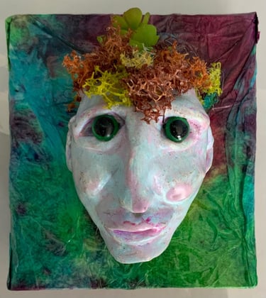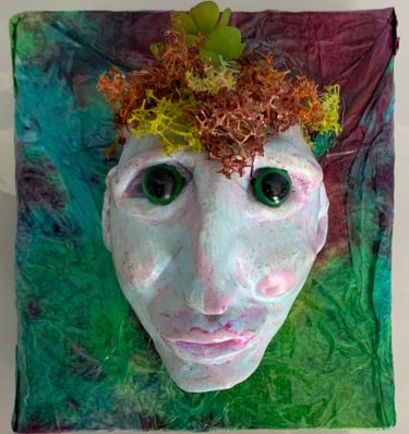 This is Flower head. Made of polymer with plastic eyes and greenery. Sits on a wooden base covered in handmade paper and varnished
