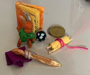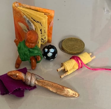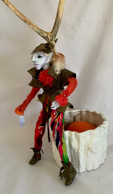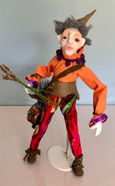 This is Lenny who has a red silk shirt with purple baubles and a leather cummerbund with matching booties and a peaked hat. He wears lycra tights and has plastic eyes and acrylic hair. His plastic string bag with leather detail holds a book, a blade, a scroll, a gem, some coins and a tiny doll. He stands at 40cm and can hold grasses or flowers.