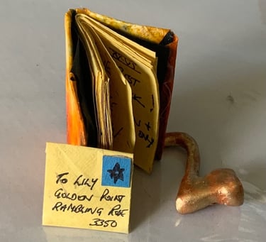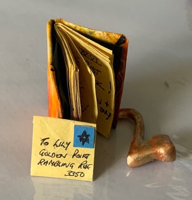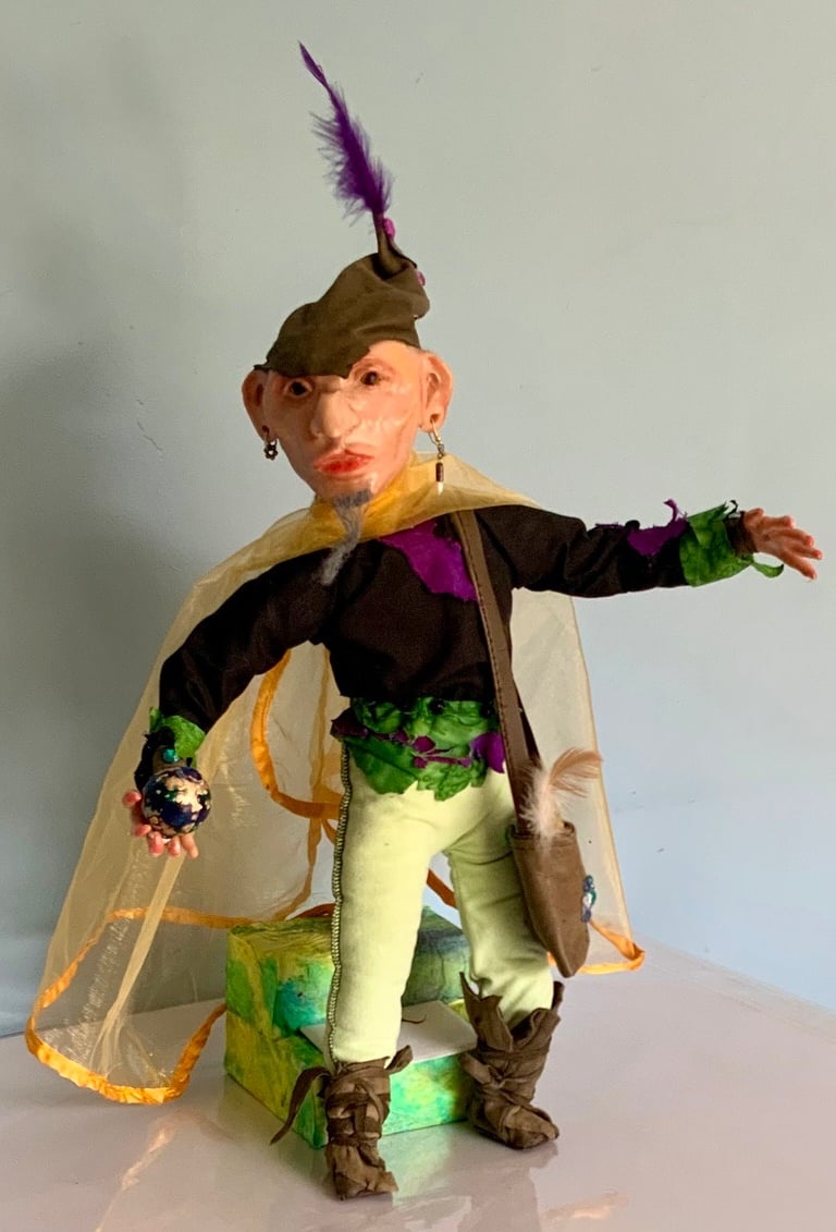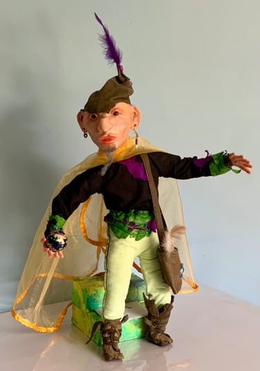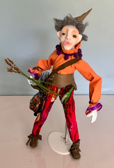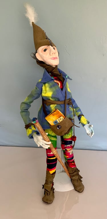 SOLD Maxwell is quite tall at 50cm. He has a dyed cotton jerkin, leather hat with a feather and boots. He wears Lycra tights and his eyes are plastic. He has a leather satchel which holds a book, pipe and letter to be posted. Has a magical walking stick. He stands at 50cm.