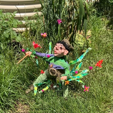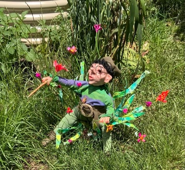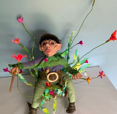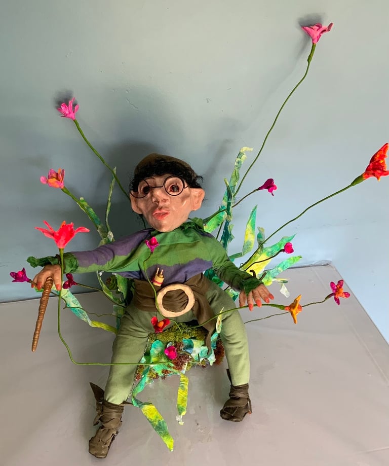 Boobah. He has polymer head hands, cloth body. He is dressed in cotton, lycra and leather. He is permanently attached to a stand with art paper and polymer flowers, wooden wand, paper scoll and he wears metal glasses. Total height 40cm