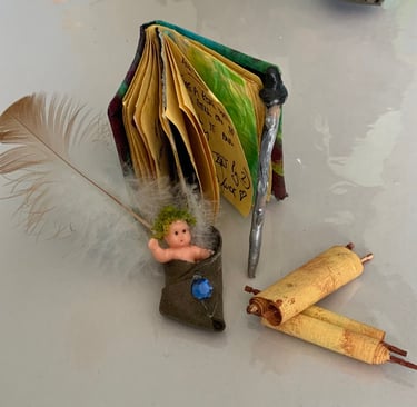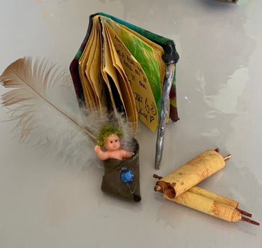 This guy is Clifford. ART doll. Polymer head, hands, cloth body. He is dressed in silk, lycra, leather and chiffon. His leather satchel holds a magic wand, paper scrolls, a little doll and a book. He holds wooden ball with crystals. He stands at 40cm
