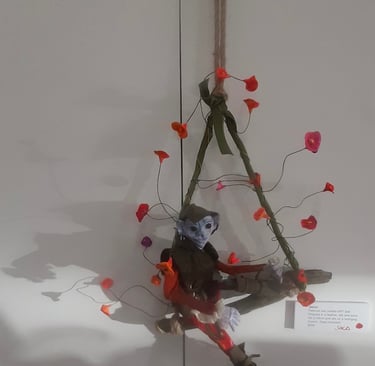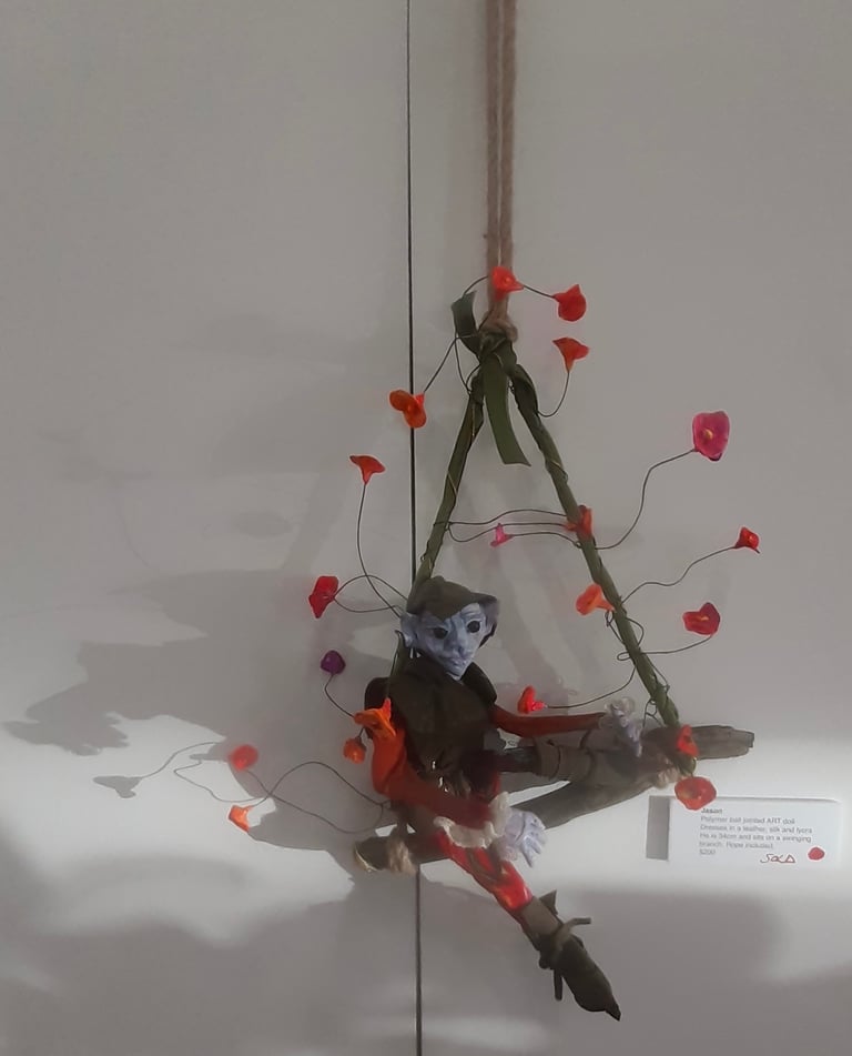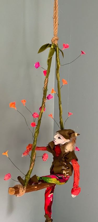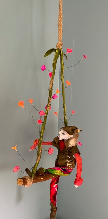 This is Jasper. He is dressed in Lycra leggings, a silk shirt and leather vest with a feather, hat and booties. He stands at 40 cm. He also comes with his own wooden swing which is covered in a garland silk ribbon and polymer flowers and hangs from rope. (See video page)